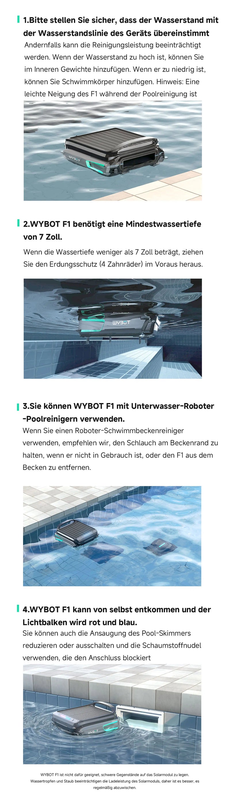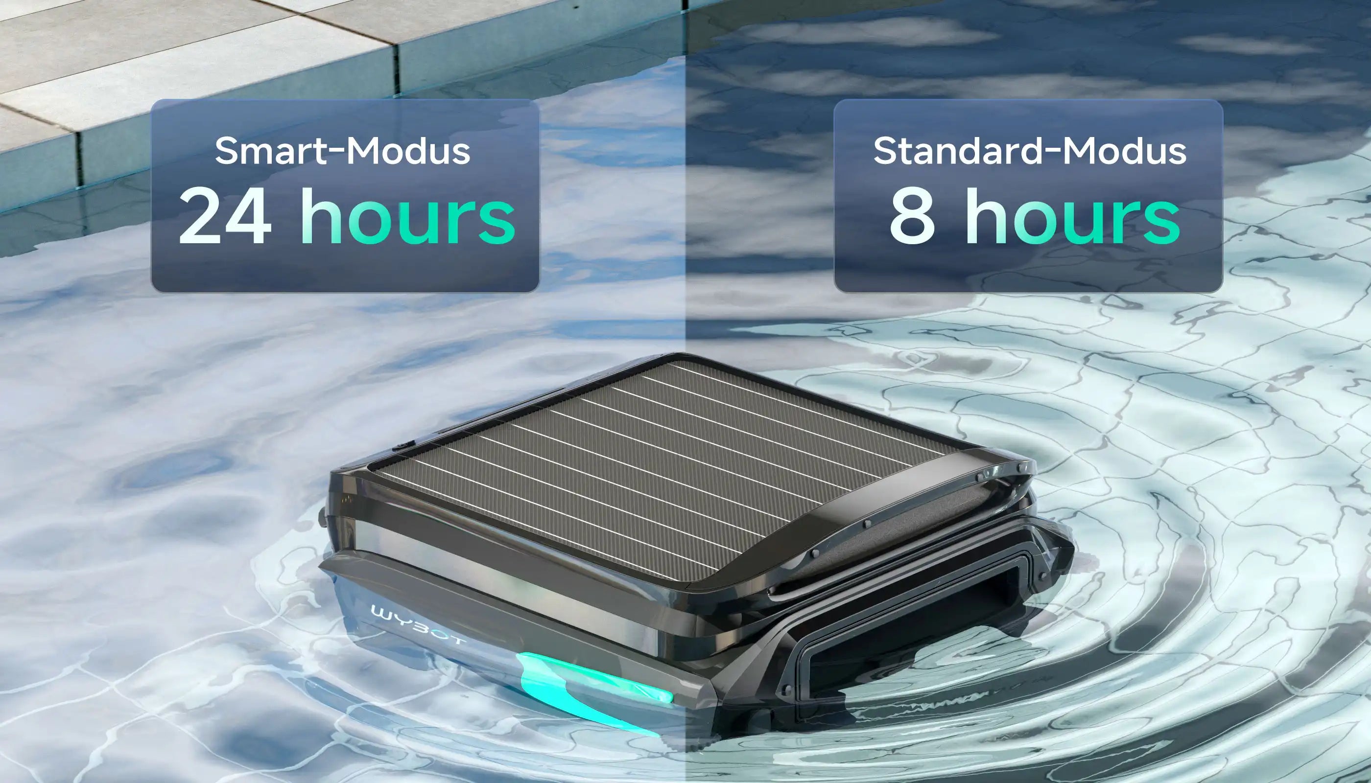 WYBOT F1 funktioniert in intelligenten Reinigungszyklen, pausiert und startet automatisch, um rund um die Uhr die Oberfläche zu reinigen. Dies stellt sicher, dass Blätter und Schmutz den ganzen Tag über entfernt werden, sodass die Oberfläche Ihres Pools frisch und einladend bleibt—ohne dass Sie sich anstrengen müssen.