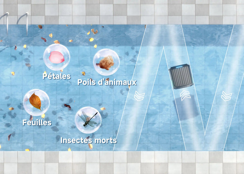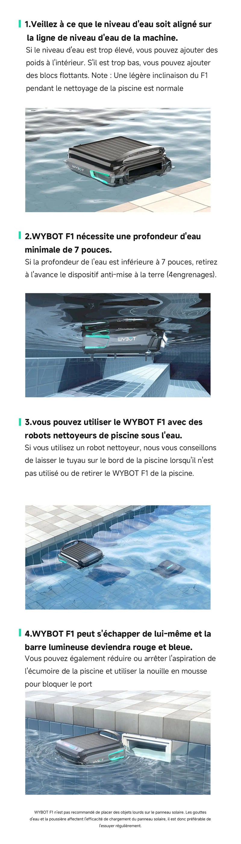 WYBOT Le F1 fonctionne avec des cycles de nettoyage intelligents, se mettant automatiquement en pause et redémarrant pour offrir un nettoyage de surface continu. Cela garantit que les feuilles et les débris sont enlevés tout au long de la journée, gardant la surface de votre piscine fraîche et accueillante—sans aucun effort de votre part.