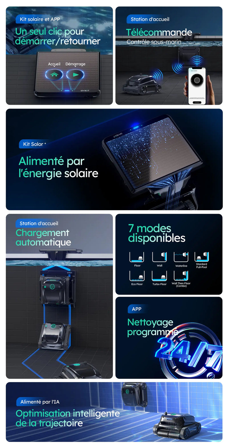 • Premier nettoyeur de piscine robotique sous-marin au monde avec options de charge doubles – Profitez de l'énergie solaire pour une charge écologique en 2 jours, ou branchez-le pour une puissance instantanée. Alternez facilement entre la charge solaire et la charge DC selon vos besoins, sans plus vous soucier des batteries.