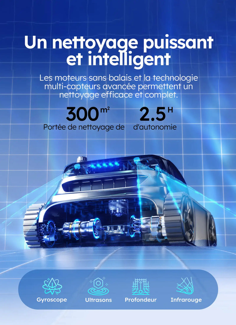 • Contrôle intelligent & opération à un clic – Contrôle à distance via l'application et démarrage/retour en un clic pour une navigation sans effort et une couverture complète de la piscine, couvrant jusqu'à 300㎡.