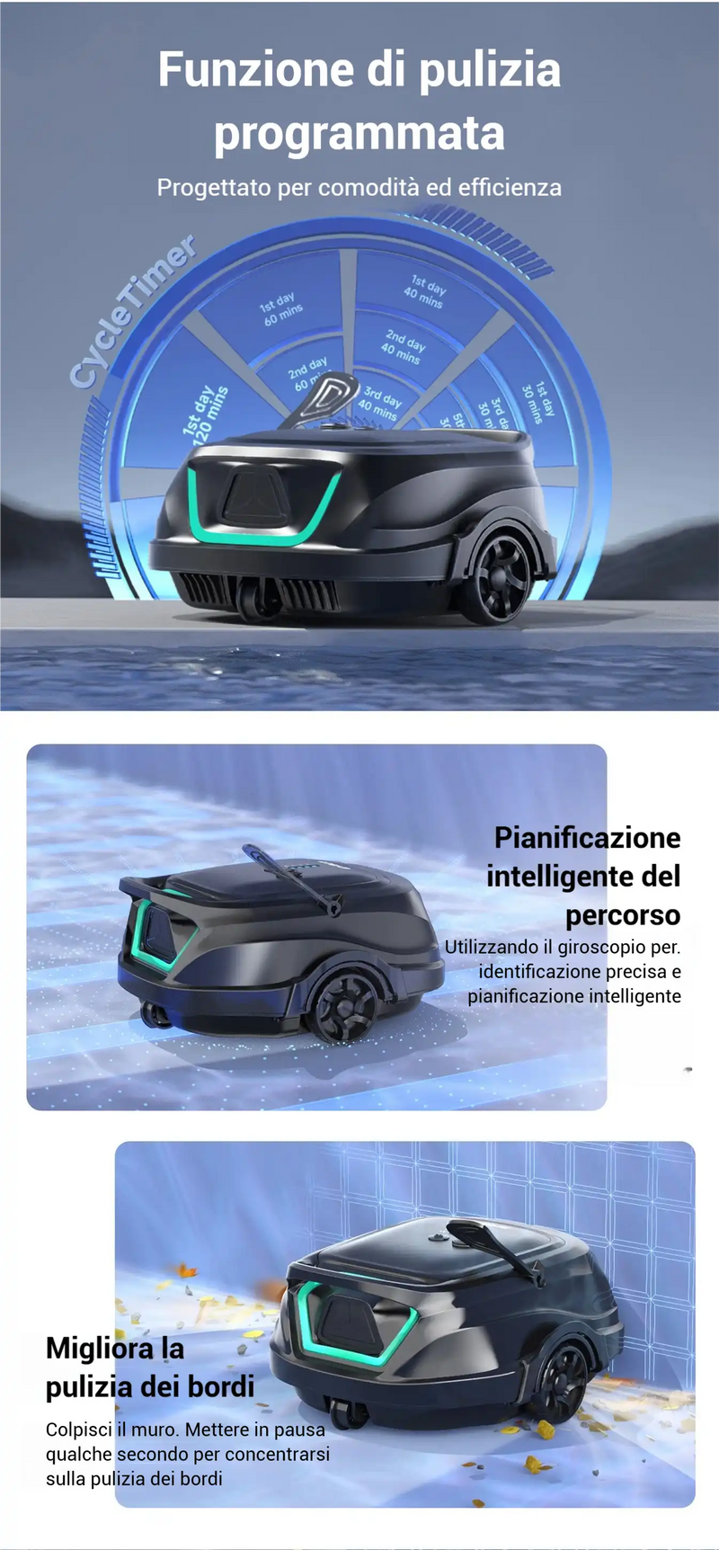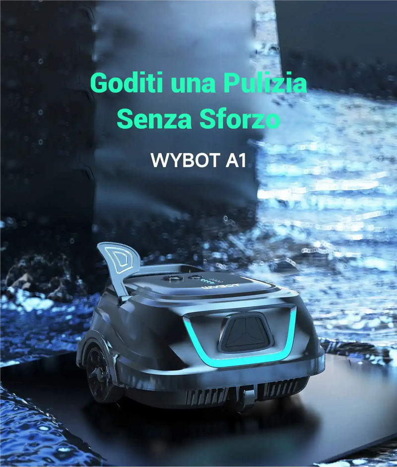 Funzione brevettata di pulizia avanzata dei bordi: Superando l'attuale sfida del settore, rappresentata dai robot per piscine che non riescono a pulire i bordi, WYBOT A1 si ferma...