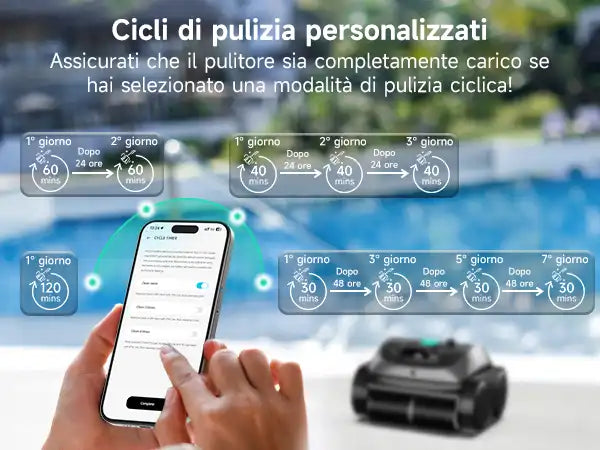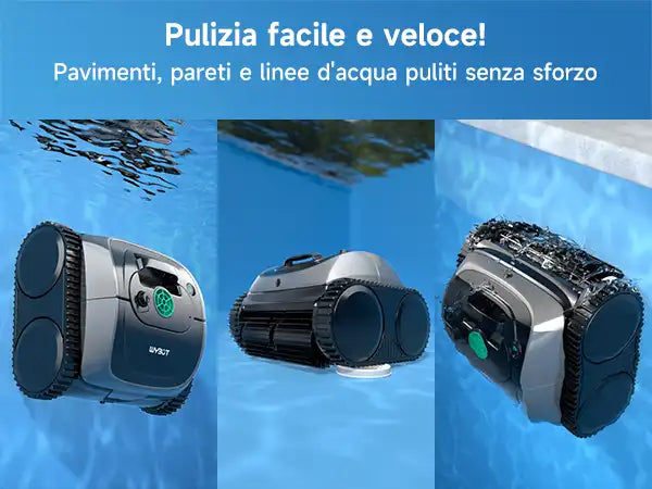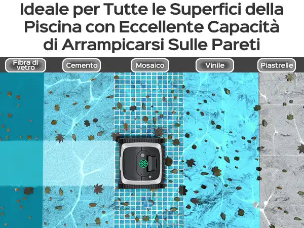 Pulizia completa della piscina: Dotato di impostazioni predefinite e modalità di pulizia versatili, questo pulitore per piscine pulisce in modo efficiente i pavimenti, le pareti e le linee d'acqua della piscina. In modalità predefinita, distribuisce in...