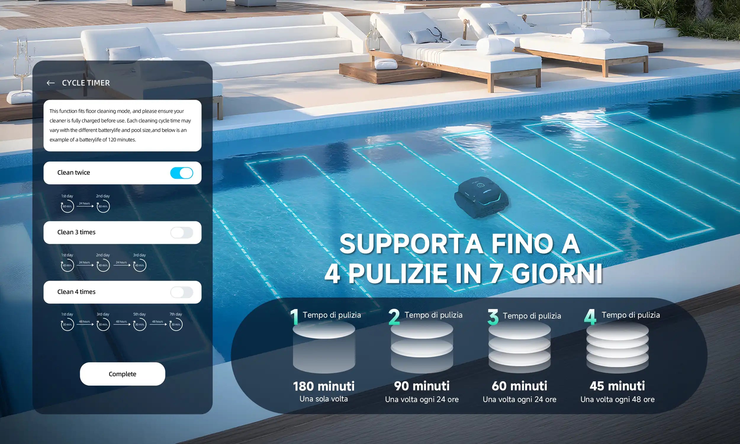 Il robot è progettato per la manutenzione quotidiana della piscina. Se l'acqua è estremamente torbida o contiene molti detriti, si consiglia di far funzionare prima il sistema di circolazione e filtraggio della piscina per migliorare la limpidezza dell'acqua prima di utilizzare il robot, al fine di ottenere prestazioni di pulizia ottimali.