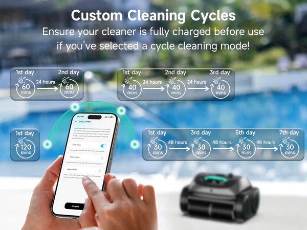 Full Pool Clean: Offering default settings and versatile cleaning modes, this pool cleaner efficiently cleans pool floors, walls, and waterlines. In default mode, it intelligently allocates cleaning time, starting with wall cleaning before moving on to a deep cleaning of the pool floor.