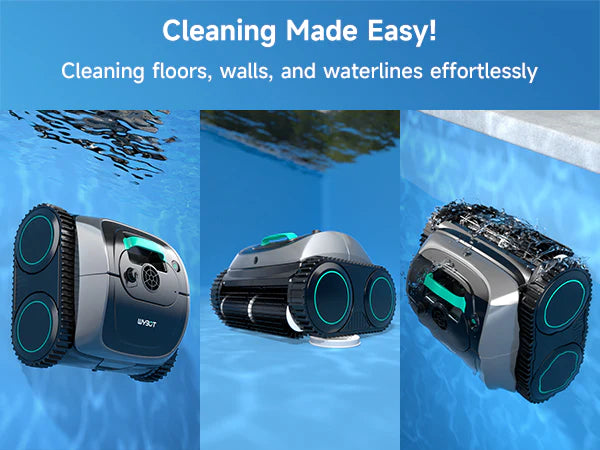 Efficient Cleaning: Equipped with an upgraded independent water pump motor, achieving a maximum filtration rate of 2642 GPH, dual PVC brushes with a strong grip, which can thoroughly and efficiently attack various debris, garbage like sands, leaves, and tough dirt from ALL pool surfaces. Ensuring a thoroughly clean and crystal-clear pool, provides you with a refreshing swimming experience.